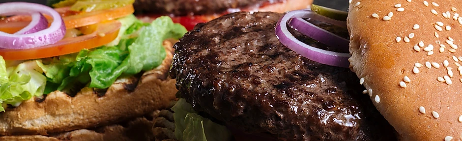100 % Rindfleisch gegrillt mit Blattsalat, Zwiebel, knusprigem Speck Cheddar-Schmelzkäse & BBQ Sauce in speziellem Burgerbrot - ACGMNO